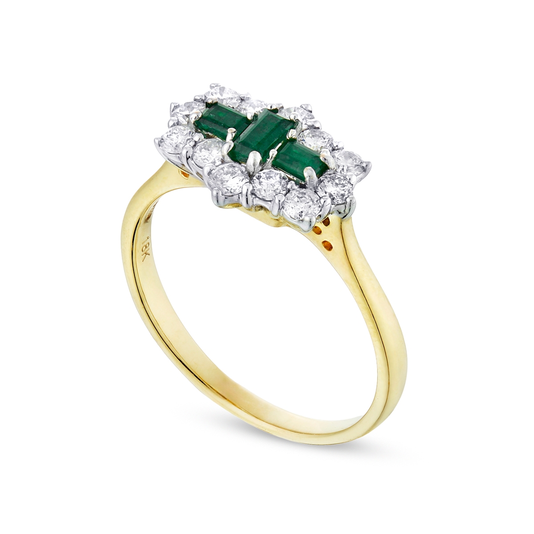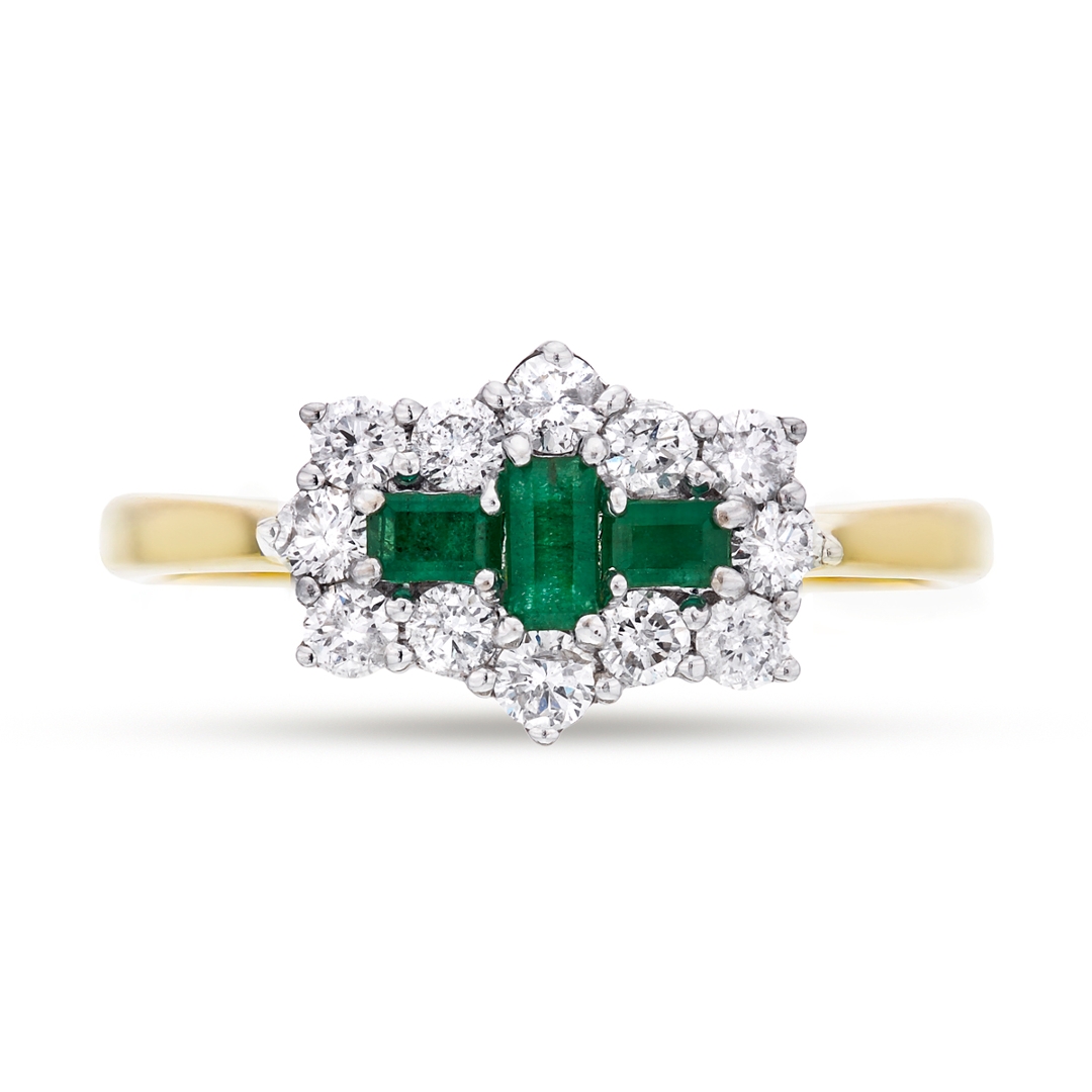 A brand-new, unused, certified natural diamond & emerald boat-shaped cluster ring, with three octagonal step-cut emerald gemstones at the centre & twelve brilliant-cut diamonds in a halo setting, set in 18ct yellow & white gold.