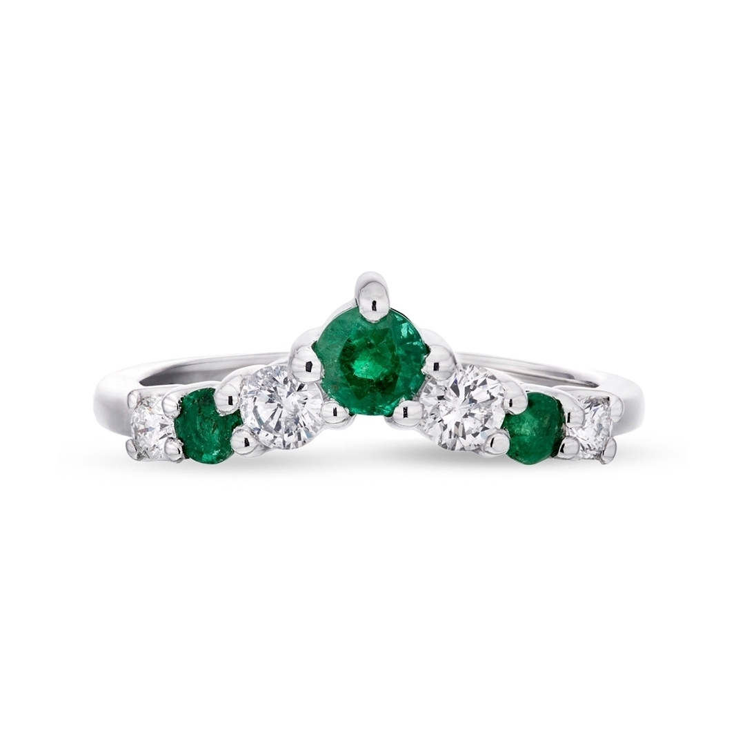 A brand-new, unused, certified natural diamond and emerald gemstone wishbone eternity ring, crafted in platinum and designed with a graceful curved silhouette that sits elegantly against the finger. The piece is set with three round mixed-cut emerald gemstones, totalling approximately 0.42 ct, each displaying a vibrant green hue that adds natural depth and character. Complementing these are four brilliant-cut natural diamonds, carefully arranged to enhance the flowing wishbone design and create a balanced interplay of colour and sparkle.
