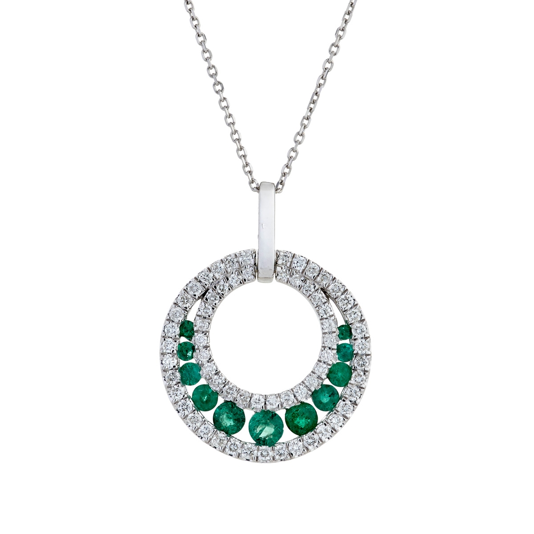 A brand-new, unused, certified natural diamond & emerald circle-shaped cluster pendant, with a cluster of round mixed-cut emerald gemstones at the centre & a cluster of brilliant-cut diamonds in a halo setting, in 9ct white gold.