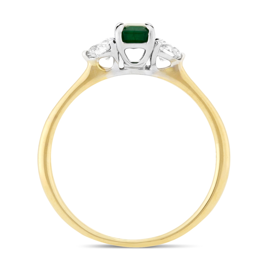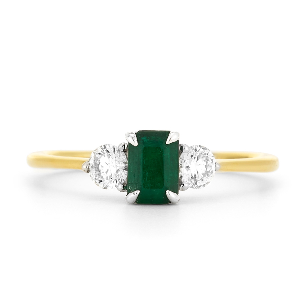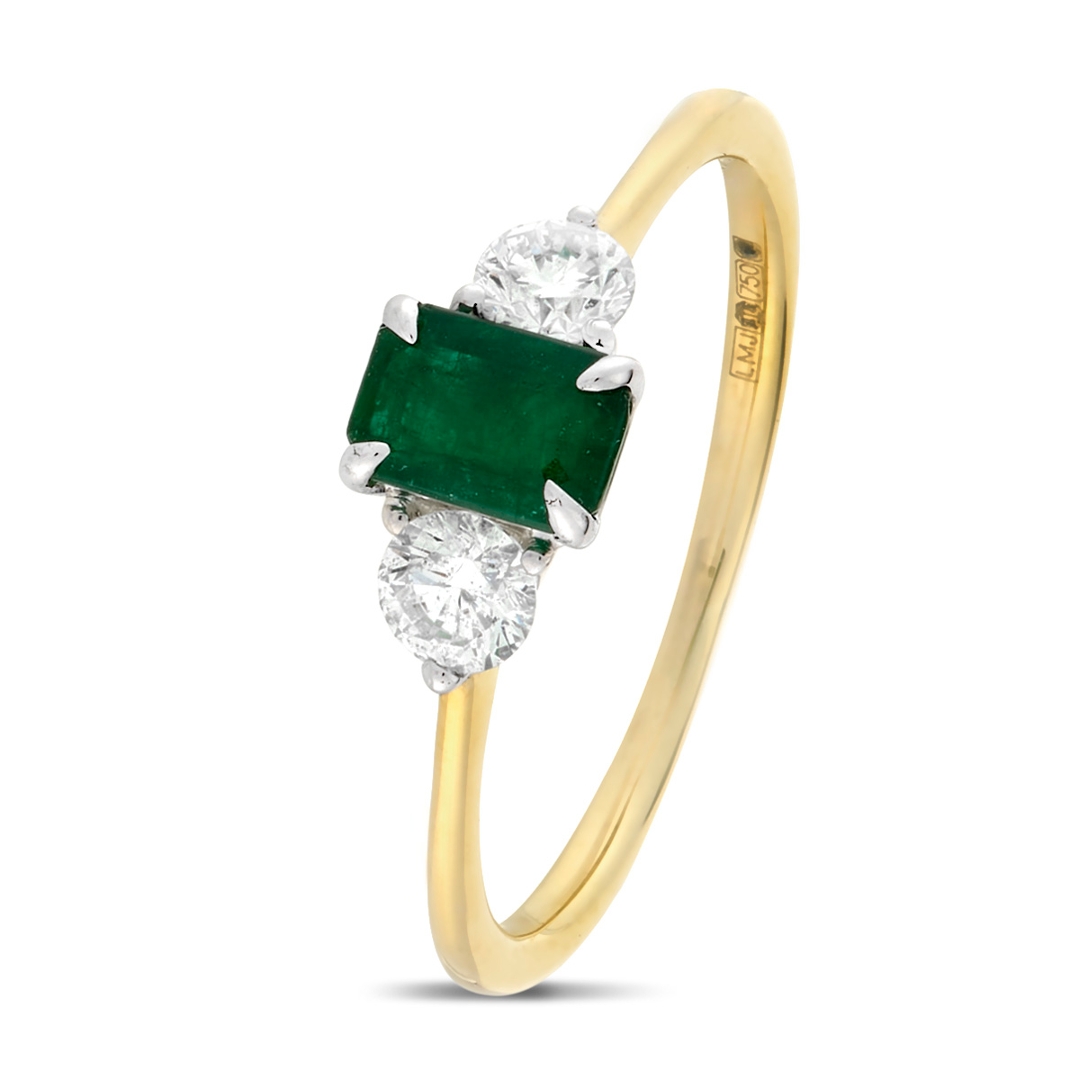 A brand new, unused, certified 18ct yellow & white gold natural diamond & emerald gemstone three-stone cluster ring, set with one octagonal step-cut emerald gemstone to the centre & two brilliant cut diamonds to the sides.