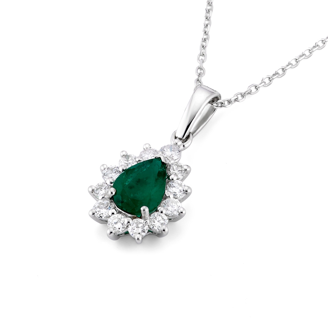 A brand-new, unused, certified natural diamond & emerald gemstone pear-shaped cluster pendant, with one pear mixed-cut emerald gemstone & a cluster of brilliant-cut diamonds, set in 18ct white gold.