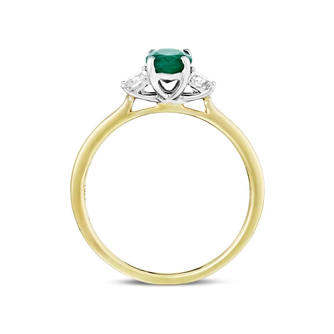 A brand-new, unused certified natural diamond and emerald three-stone cluster ring, crafted in an elegant combination of 18ct yellow and white gold, offering a timeless design with a refined two-tone finish. At the centre sits an oval mixed-cut emerald weighing approximately 0.74ct, displaying a rich green hue with natural vibrancy and depth. Positioned to either side are two brilliant-cut natural diamonds, forming a classic three-stone arrangement that enhances the presence of the central gemstone while maintaining a balanced and sophisticated profile.
