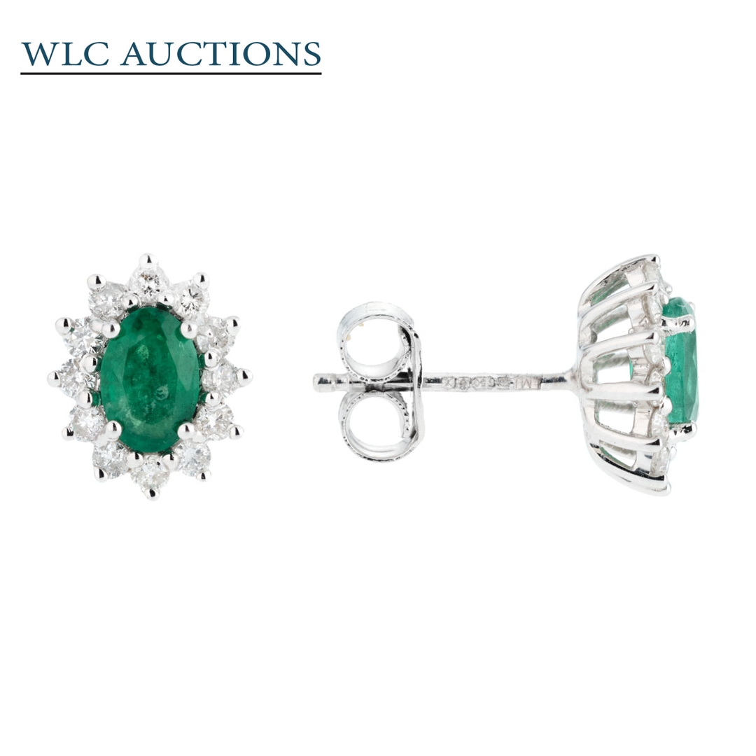 A brand-new, unused certified pair of natural diamond and emerald gemstone cluster earrings, beautifully crafted in 18ct white gold. Each earring features a vibrant oval mixed-cut emerald, weighing 0.96 carats and displaying a lush green hue that embodies natural elegance and timeless appeal. Surrounding the emeralds is a refined cluster of brilliant-cut natural diamonds, totalling 0.51 carats, with G-H colour and SI1–SI2 clarity. The crisp sparkle of the diamonds perfectly complements the rich tones of the emeralds, while the white gold setting enhances the cool brilliance of the overall design, creating a look of sophistication and balance.
