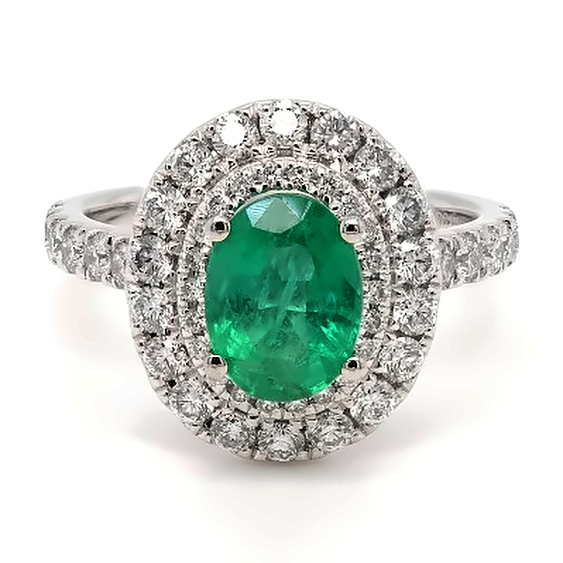 A brand-new, unused, certified natural diamond and emerald oval-shaped cluster ring, designed to balance vivid colour with impressive diamond brilliance. At its centre sits a 1.27ct oval-cut emerald, displaying rich green saturation and elegant symmetry. The elongated oval enhances finger coverage, while a carefully structured double halo of brilliant-cut natural diamonds surrounds the centre stone, intensifying its presence and creating a bold, layered frame.