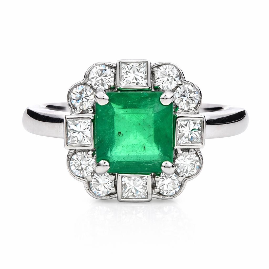 A brand-new, unused, certified natural diamond and emerald flower-shaped cluster ring, expertly crafted in platinum and centred around an emerald-cut emerald weighing 1.35 carats. The emerald presents a rich green tone with strong clarity, a characteristic typical of natural stones, offering depth and elegance at the heart of the design. Surrounding the centre stone is a refined halo composed of four princess-cut diamonds and eight brilliant-cut diamonds, arranged to create a balanced floral silhouette while maximising light performance. With a total diamond weight of 0.49 carats, the diamonds provide crisp brilliance and structure, enhancing the emerald’s natural colour without overwhelming it.