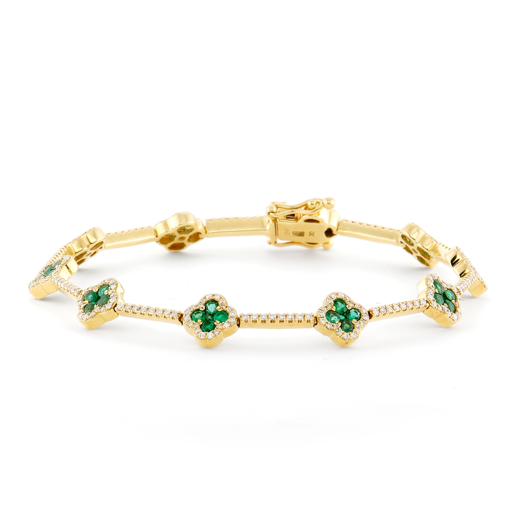 A brand-new, unused 18ct yellow gold bracelet crafted with elegance and luxury, set with a refined combination of natural emeralds and diamonds in a classic cluster design. The piece features 50 round, mixed-cut emeralds, totalling 1.54ct, each displaying a vivid green hue long associated with vitality and prosperity. Enhancing their beauty are 280 round brilliant cut natural diamonds, weighing a total of 1.27ct, graded F–G for colour and SI1–SI2 for clarity, which add a bright sparkle that contrasts beautifully with the emeralds.