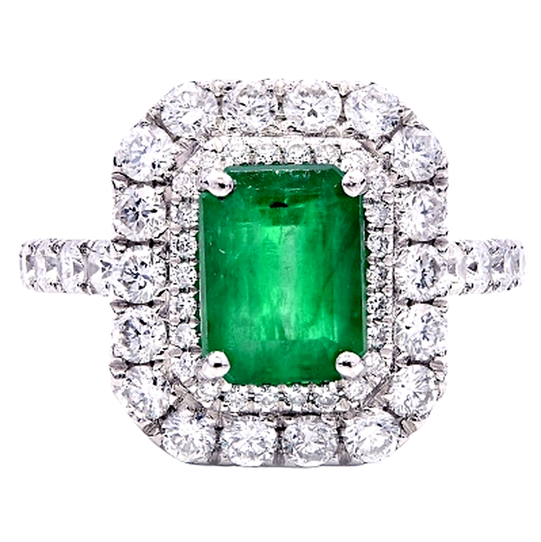 A brand-new, unused, certified natural diamond and emerald Asscher-shaped cluster ring, centred with a commanding 1.92ct emerald-cut emerald displaying rich, vibrant green saturation and striking clarity. The precise step-cut facets create a refined hall-of-mirrors effect, allowing the gemstone’s depth of colour to unfold beautifully in changing light. Encircling the centre stone is a dramatic double halo of brilliant-cut natural diamonds, extending seamlessly onto the shoulders and bringing the total diamond weight to an impressive 1.35ct for exceptional brilliance and presence.