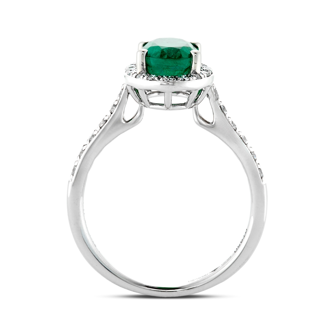 A brand-new, unused ring showcasing a magnificent 3.52-carat natural emerald, certified by the World Gemological Institute. This exceptional gemstone displays an intense, vividly saturated green hue that captures the light beautifully, revealing its depth and natural radiance with every glance. Its remarkable colour and clarity reflect the very essence of luxury, while the precision of its oval cut enhances its brilliance and allure. Surrounding the emerald is a halo of round brilliant-cut diamonds totalling 0.48 carats, each one meticulously set to amplify the gemstone’s striking presence.