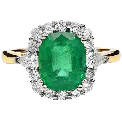 A brand-new, unused, certified natural diamond & emerald gemstone cluster ring, set with one cushion-cut emerald gemstone at the centre, two marquise cut diamonds to the sides & a cluster of brilliant-cut diamonds in a halo setting, set in platinum & 18ct yellow gold.