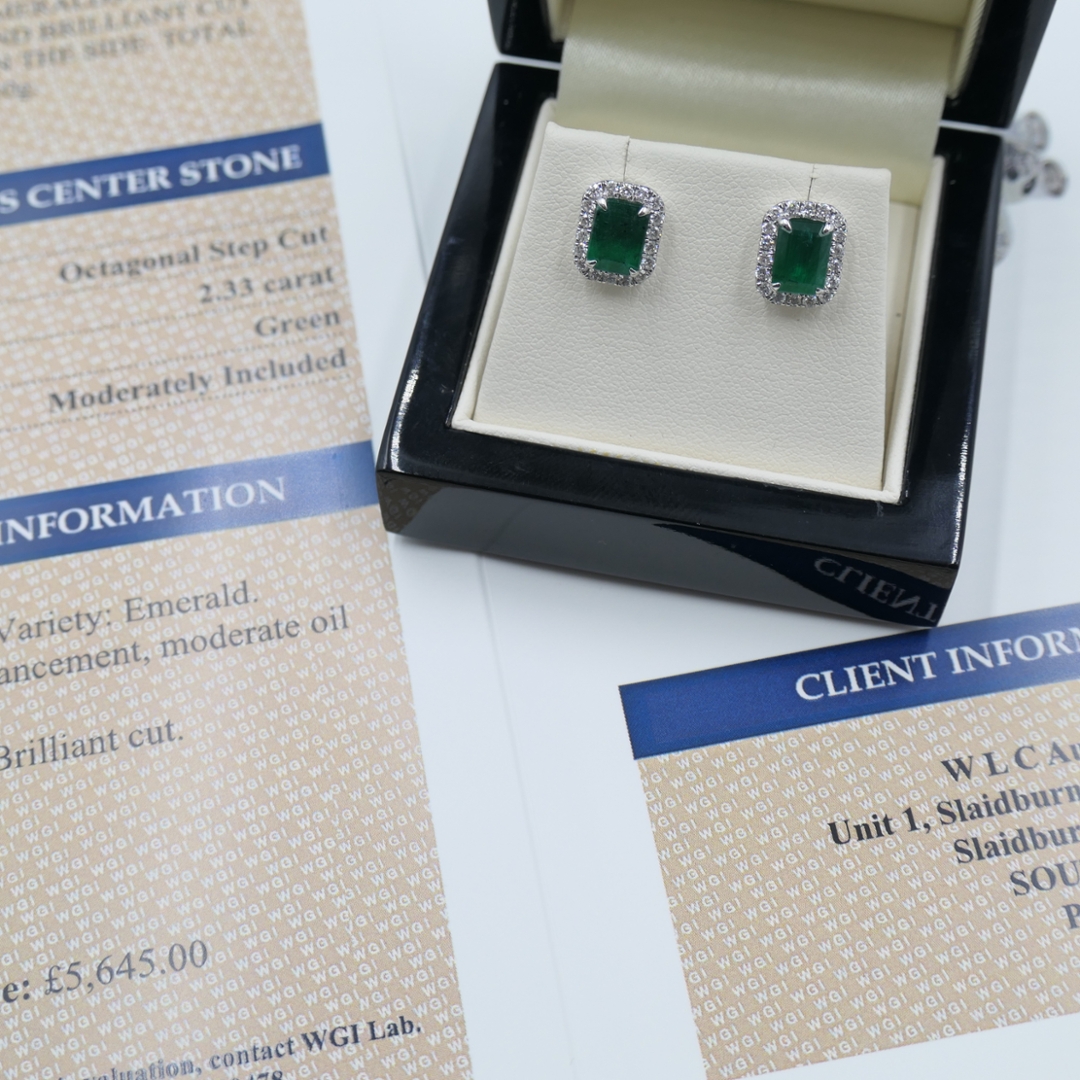 A brand-new, unused certified pair of natural diamond and emerald gemstone cluster earrings, elegantly crafted in 18ct white gold. Each earring showcases a stunning octagonal step-cut emerald, weighing 2.33 carats and displaying a rich, velvety green hue that embodies timeless elegance and natural allure. Surrounding each emerald is a refined cluster of brilliant-cut natural diamonds, totalling 0.40 carats, with G-H colour and SI1–SI2 clarity. The sparkling diamonds highlight the depth of the emeralds’ tone, while the cool white gold setting enhances their vivid green brilliance with an air of sophistication and grace.