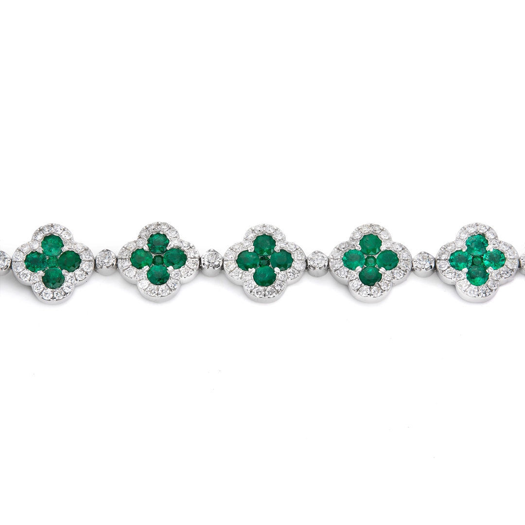 A brand-new, unused 18ct white gold bracelet crafted with exquisite detail, featuring a striking combination of natural emeralds and diamonds in a refined cluster design. The bracelet is set with 70 round mixed-cut emeralds, totalling 4.51ct, each displaying a vibrant green hue, enhanced by natural inclusions that give the stones their unique character. Surrounding these are 294 round brilliant cut natural diamonds, with a combined weight of 2.57ct, graded F–G for colour and SI1–SI2 for clarity, adding brilliance and contrast that perfectly accentuates the deep green of the emeralds.