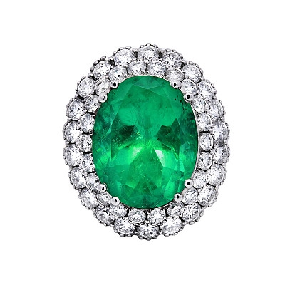A brand-new, unused, certified diamond & emerald gemstone oval-shaped cluster ring, set with one oval-cut emerald gemstone at the centre & a cluster of brilliant-cut diamonds in a double halo setting & to the shoulders, set in platinum.