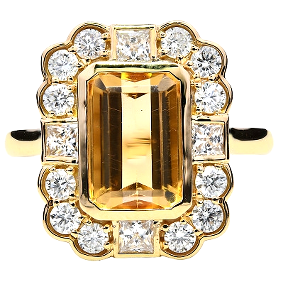 A brand-new, unused, certified natural diamond and golden topaz flower-shaped cluster ring that combines warmth, colour, and enduring value within a finely balanced design. At its centre sits an emerald-cut golden topaz weighing 2.66 carats, chosen for its rich honeyed tone and clean step-cut facets that enhance clarity and elegance. The centre stone offersa strong presence while remaining refined and timeless in character.