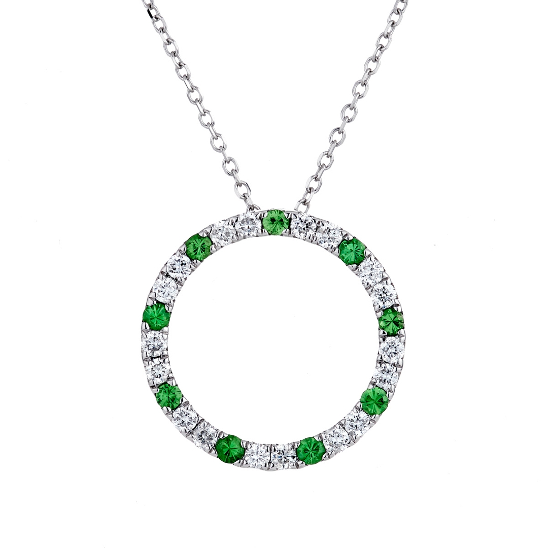 A brand-new, unused, certified natural diamond & green garnet circle-shaped cluster pendant, with nine round-cut green garnet gemstones & eighteen brilliant-cut diamonds, in 18ct white gold.