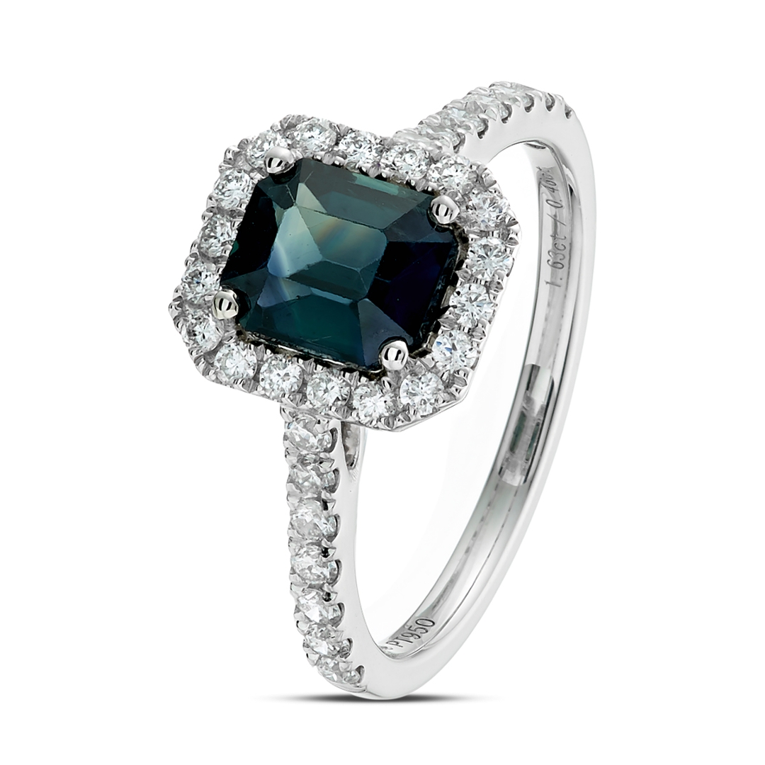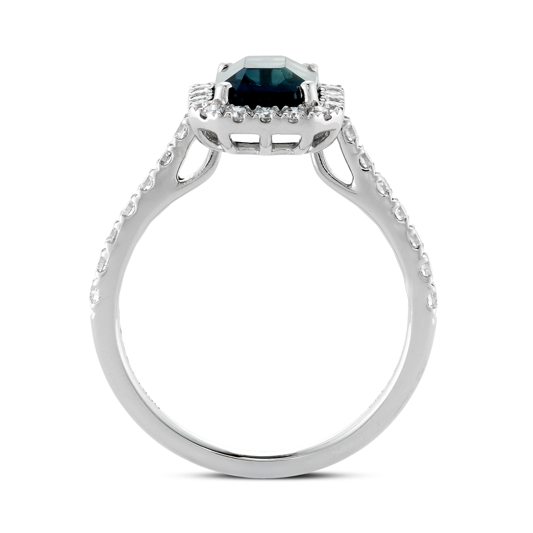 A brand-new, unused certified natural diamond and green sapphire cluster ring that exudes sophistication, rarity, and refined luxury. At its centre lies a 1.63-carat octagonal step-cut green sapphire, displaying an alluring bluish-green hue that shifts beautifully in the light. Surrounding the central gemstone is a halo of brilliant-cut natural diamonds, which continue elegantly along the shoulders to create a radiant, balanced composition. The diamonds, totalling 0.64 carats, are graded G–H in colour and SI1–SI2 in clarity, offering a bright, lively sparkle that perfectly enhances the sapphire’s vivid tone.