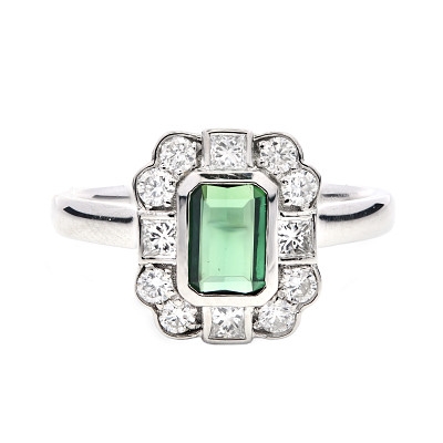 A brand-new, unused, certified natural diamond & green tourmaline gemstone cluster ring, set with one emerald-cut green tourmaline gemstone at the centre & a cluster of brilliant-cut diamonds in a halo setting, set in platinum.