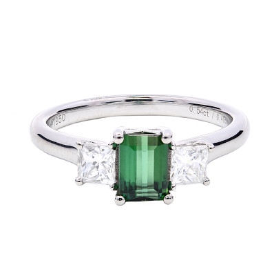 A brand-new, unused certified platinum ring showcasing a captivating 0.54ct emerald-cut green tourmaline gemstone at its centre, displaying a rich, verdant hue with remarkable brilliance. Flanked by two natural brilliant-cut diamonds totalling 0.40ct, the three-stone arrangement creates a perfectly balanced and timeless design. Each diamond, graded G-H in colour and SI clarity, enhances the vivid green tones of the tourmaline, while the platinum setting offers a refined, enduring backdrop that highlights the natural beauty of every stone.