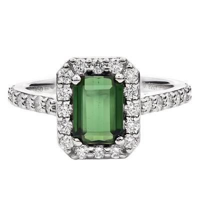 A brand-new, unused, certified natural diamond & green tourmaline gemstone emerald-shaped cluster ring, with one emerald-cut green tourmaline gemstone at the centre & a cluster of brilliant-cut diamonds in a halo setting & to the shoulders, set in platinum.
