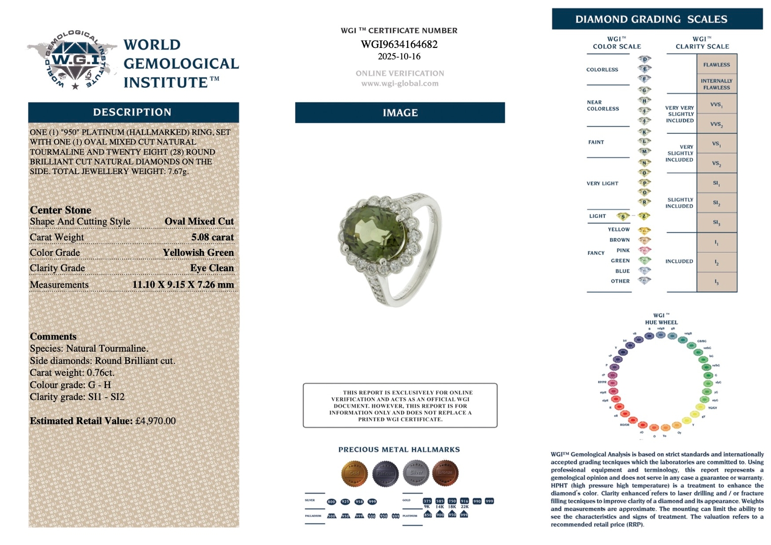 A brand-new, unused certified natural diamond and green tourmaline cluster ring that showcases exquisite craftsmanship and vibrant natural beauty. At its centre lies a magnificent 5.08-carat oval mixed-cut green tourmaline, radiating a rich yellowish-green hue with captivating brilliance and depth. Surrounding the central gemstone is a floral-inspired halo of brilliant-cut natural diamonds that continue along the shoulders, creating a dazzling display of light and symmetry. The diamonds, totalling 0.76 carats, are graded G–H in colour and SI1–SI2 in clarity, providing a luminous sparkle that perfectly enhances the tourmaline’s vivid tone.