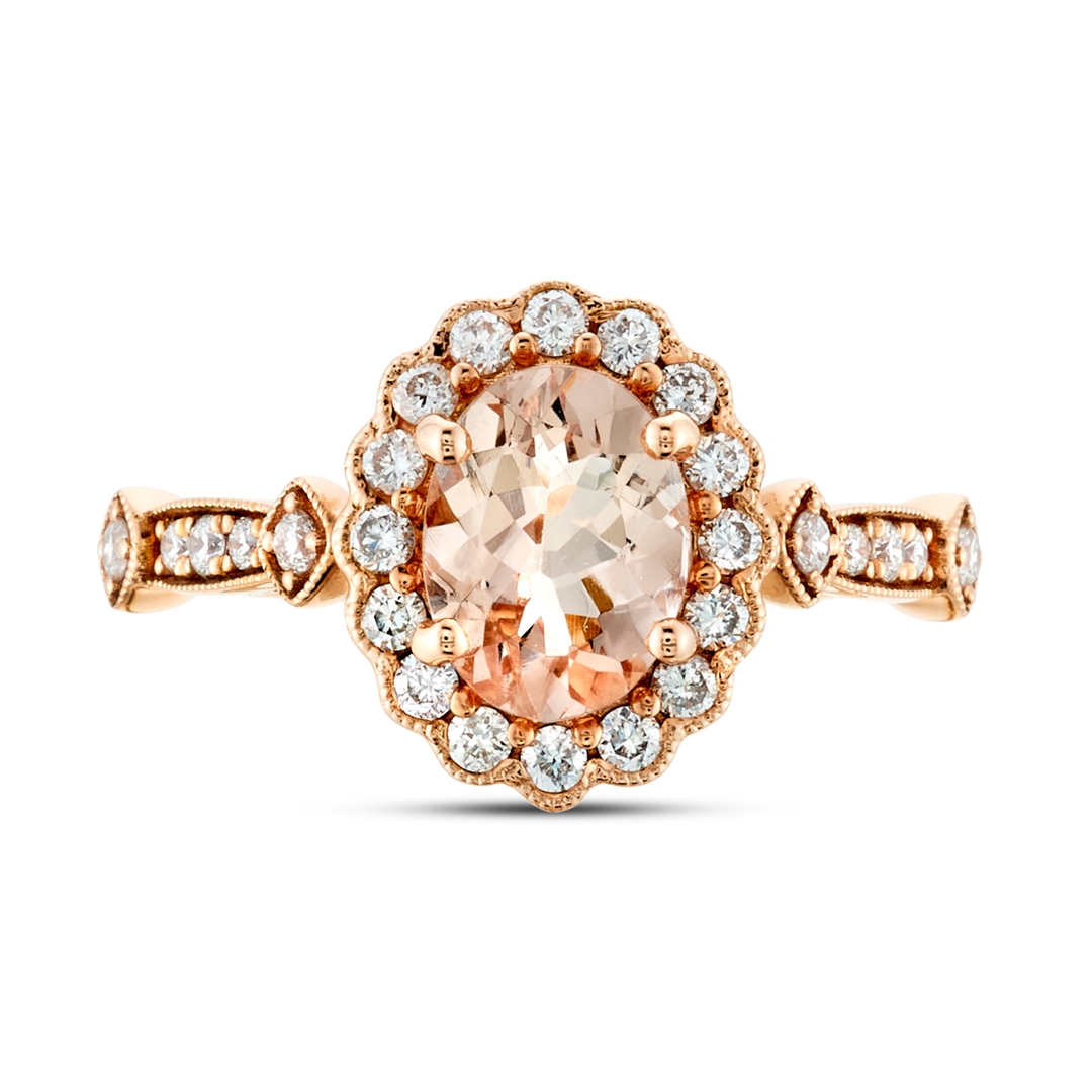 A brand-new, unused, certified natural diamond & morganite flower-shaped cluster ring, with one oval mixed-cut morganite gemstone to the centre & a cluster of brilliant-cut diamonds in a halo setting & on the shoulders, set in 18ct rose gold.