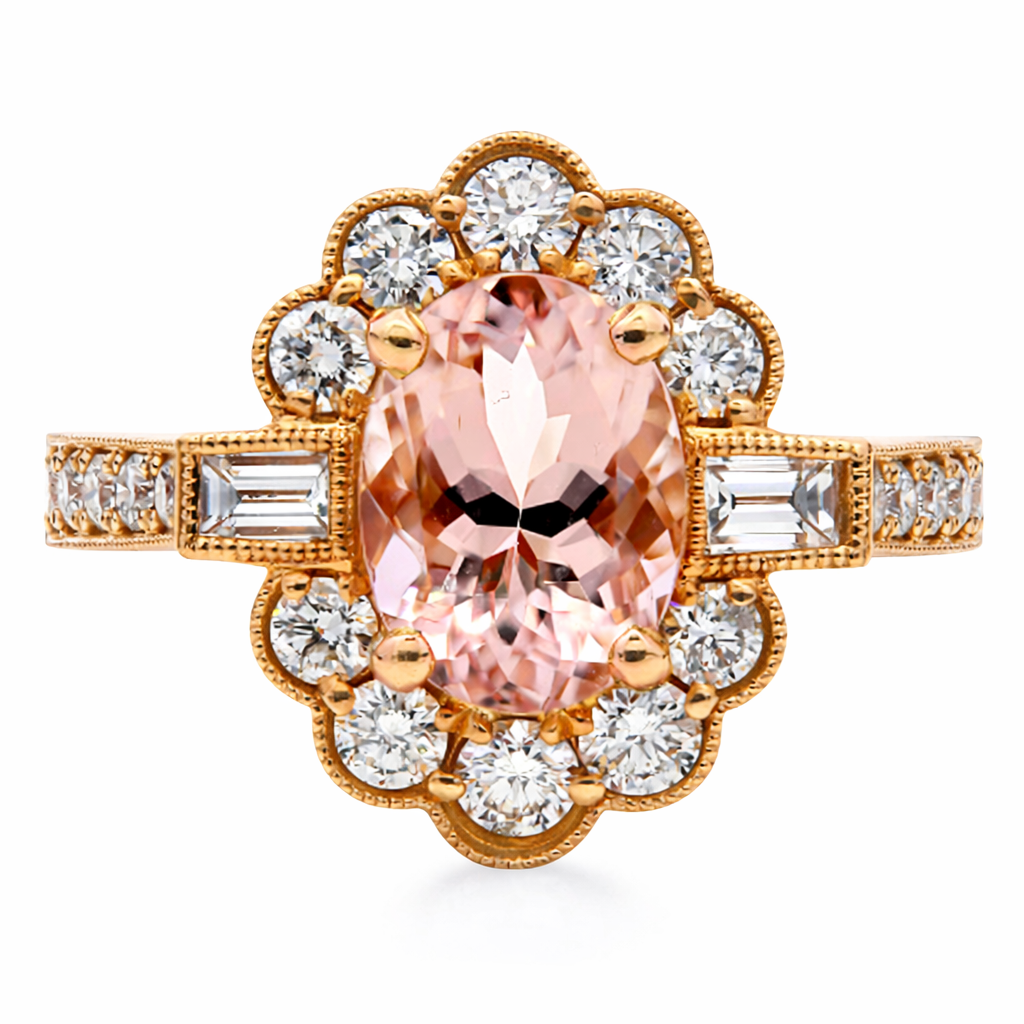 A brand-new, unused, certified natural diamond & morganite flower-shaped cluster ring, with one oval-cut morganite gemstone at the centre, two baguette-cut diamonds to the sides & a cluster of brilliant-cut diamonds in a halo setting & on the shoulders, set in 18ct rose gold.