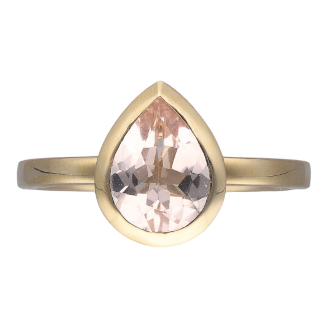 A brand-new, unused, certified natural morganite gemstone ring, set with one pear-cut morganite gemstone at the centre, set in 18ct yellow gold.