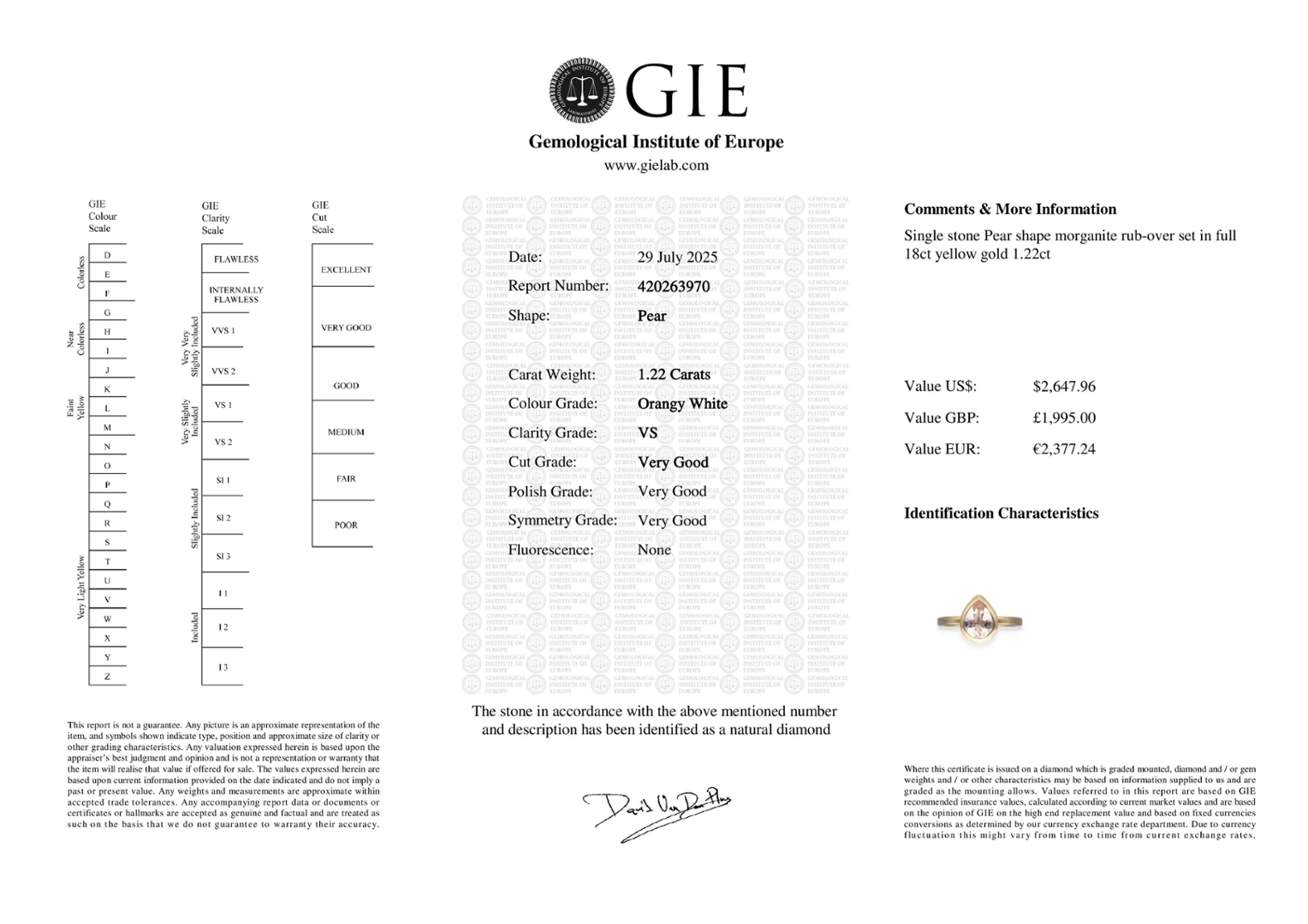 A brand-new, unused, certified 18ct yellow gold ring, showcasing a 1.22ct pear-cut natural Morganite as its centrepiece. The gemstone displays a delicate orangy-white hue, a colour prized for its soft elegance and refined charm. Graded VS in clarity, the stone is free from visible inclusions to the naked eye, allowing its natural beauty and transparency to shine through. The rub-over setting secures the gem while highlighting its elongated pear shape, a cut admired for its ability to elongate the finger and maximise brilliance.