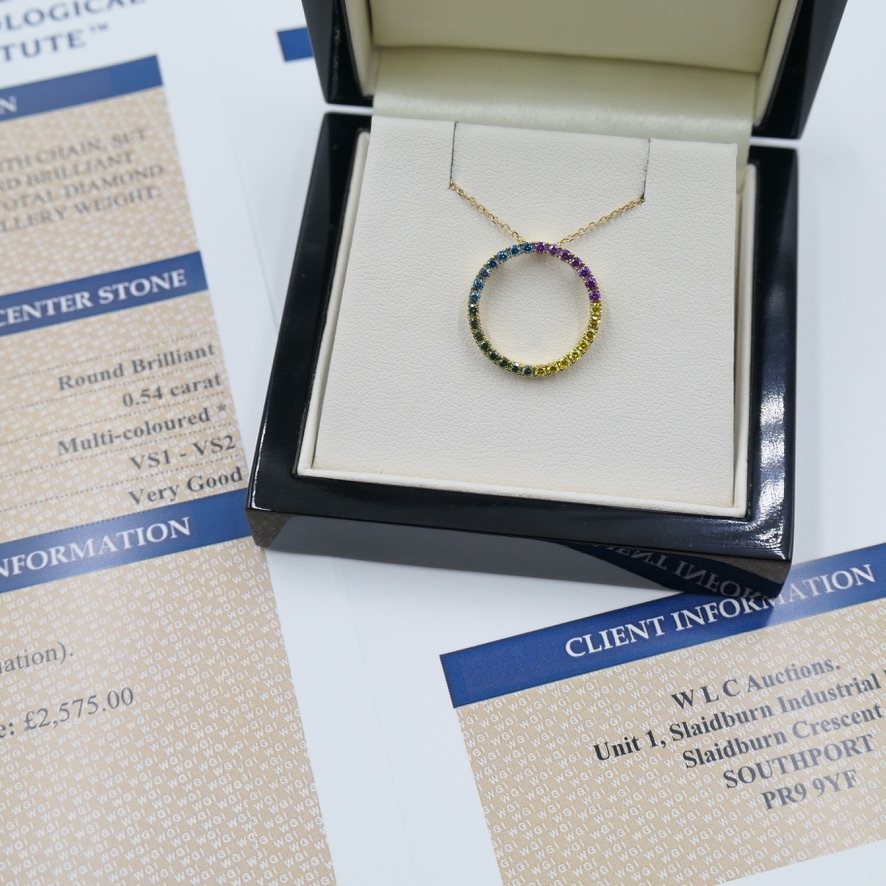 A brand-new, unused 18ct yellow gold pendant that radiates contemporary charm and captivating colour. This striking circle-shaped cluster pendant is set with a dazzling arrangement of natural multi-coloured brilliant-cut diamonds, totalling 0.54 carats. Each diamond, graded VS1–VS2 in clarity, has been expertly cut to achieve exceptional brilliance and vibrant sparkle. The seamless blend of hues — from soft yellows and blues to vivid pinks and greens — creates a mesmerising play of light, beautifully contrasted against the rich tones of the yellow gold setting. The circular design, symbolising eternity and harmony, makes this pendant both a fashionable statement and a timeless keepsake.