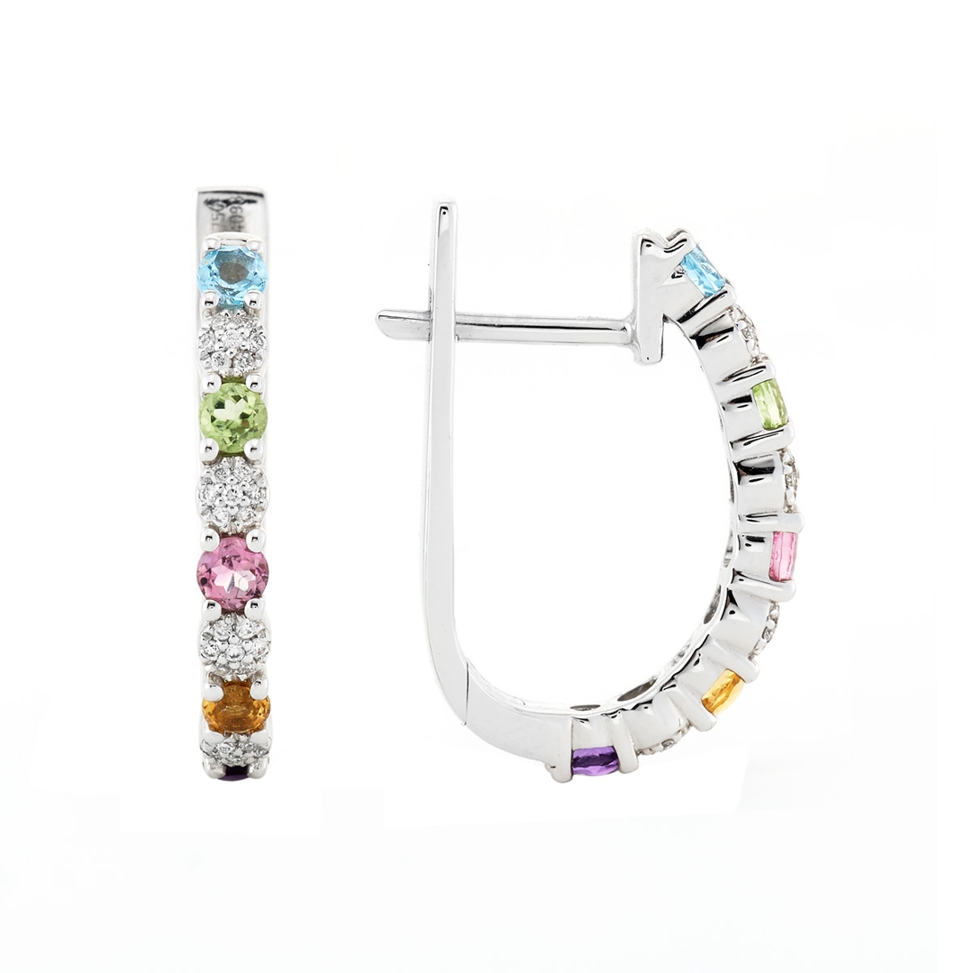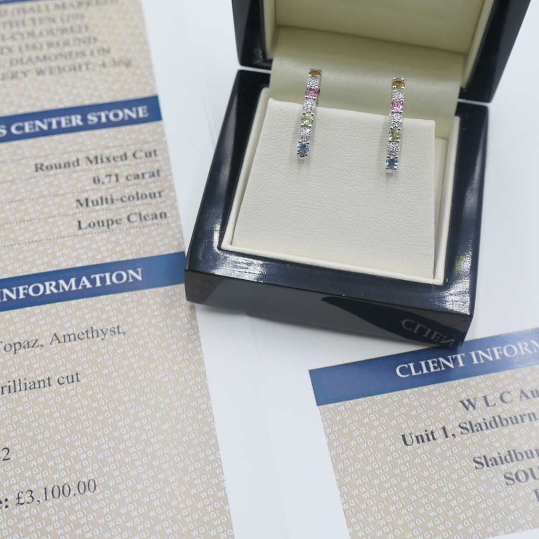 A brand new, unused certified pair of natural diamond & multi-coloured precious gemstone hooped earrings, set with a cluster of round mixed cut multi-coloured precious gemstones & a cluster of brilliant cut diamonds. The precious gemstones are natural zircon, citrine, topaz, amethyst & tourmaline, set in 18ct white gold.
