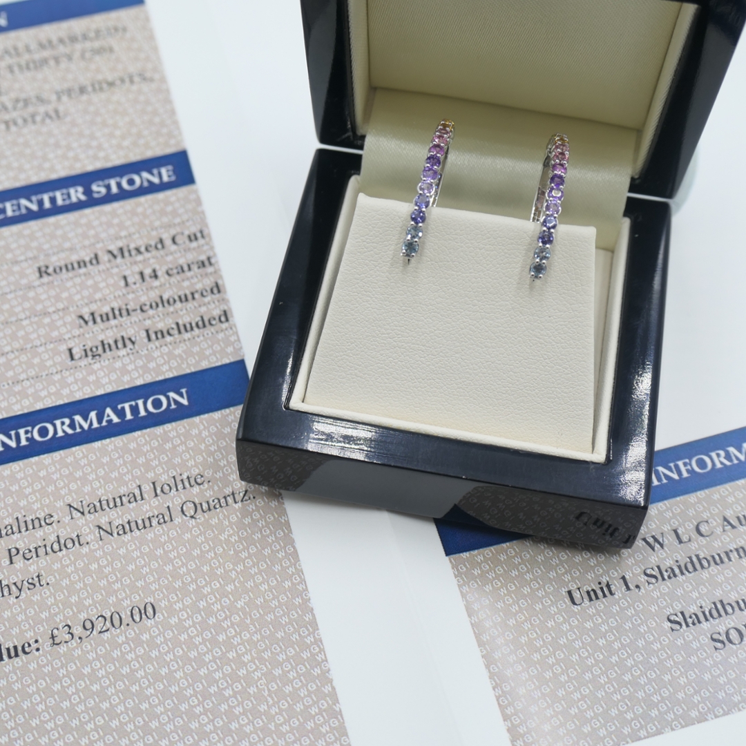 Natural gemstones are valued not only for their beauty but also for their individuality, with each stone offering a unique character shaped by nature over millions of years. Fine multi-gemstone jewellery, such as this, is admired for its versatility, timeless appeal, and the craftsmanship required to achieve such a perfect balance in design. The variety of gemstones ensures the earrings complement a wide range of styles and occasions, making them a valuable and enduring addition to any collection. Supplied with certification and a professional valuation of £3,920.00, they are a luxurious expression of colour, elegance and expert jewellery artistry.
