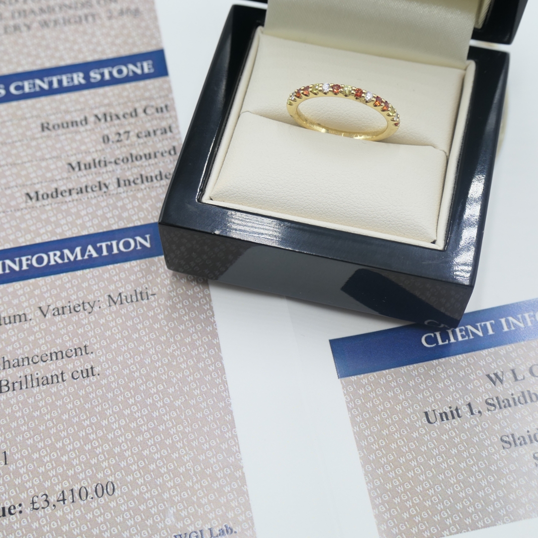 A brand-new, unused certified 18ct yellow gold eternity ring, crafted to blend the vivid beauty of sapphires with the timeless sparkle of natural diamonds. Set with a total of 0.27ct of round, mixed-cut, multi-coloured sapphires, each gemstone has been carefully selected for its vibrant hue, clarity, and brilliance, forming a lively and elegant band of colour. Enhancing this display are 0.09ct of mixed cut natural diamonds, graded G-H in colour and VS2-SI1 in clarity. The bright, crisp sparkle of the diamonds contrasts beautifully with the warm glow of the yellow gold setting, creating a sophisticated design that is both eye-catching and refined.