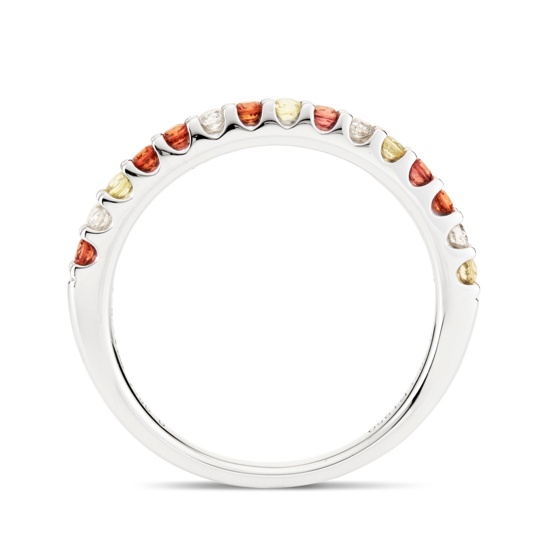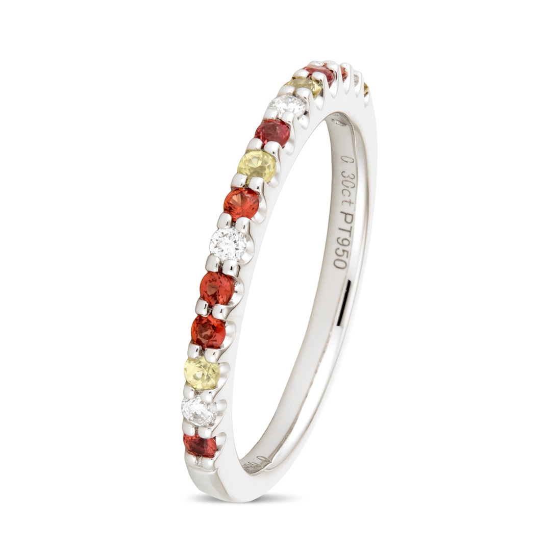 A brand-new, unused certified platinum cluster ring, 3.41 grams, crafted to showcase the vibrant elegance of sapphires alongside the timeless beauty of natural diamonds. Set with a total of 0.30ct of round, mixed-cut, multi-coloured sapphires, each gemstone has been carefully selected for its vivid hue, clarity, and sparkle, creating a lively yet refined display of colour that flows seamlessly around the band. Accompanying the sapphires are 0.08 ct of mixed-cut natural diamonds, graded G-H in colour and VS1-VS2 in clarity. Their crisp, bright brilliance contrasts perfectly with the richness of the sapphires and the enduring superb lustre of platinum, adding both sophistication and charm to the piece.