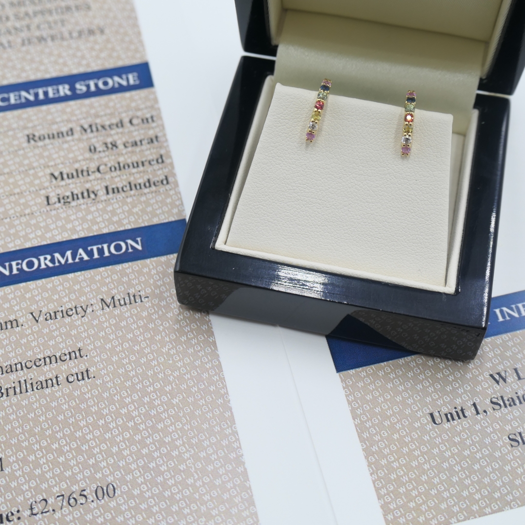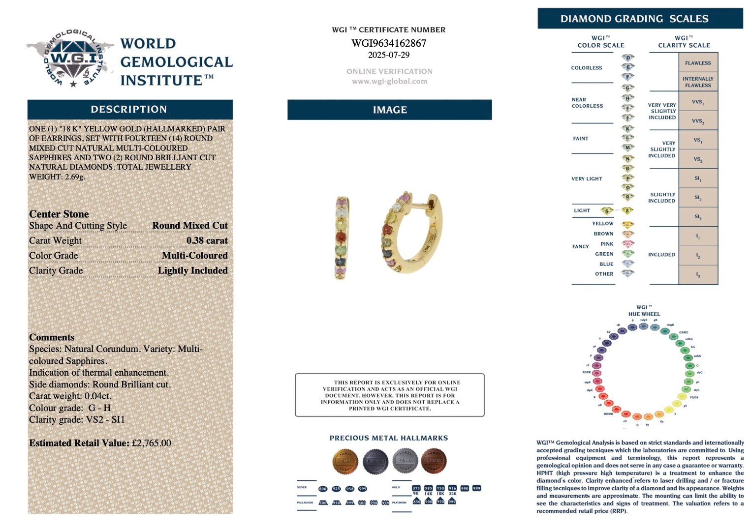 A brand-new, unused certified pair of 18ct yellow gold hooped earrings, crafted to blend the lively beauty of sapphires with the refined sparkle of natural diamonds. Set with a total of 0.38ct of round, mixed-cut, multi-coloured sapphires, each gemstone has been carefully selected for its vivid tone, clarity, and brilliance, creating a colourful and elegant display along the hoops. Enhancing the sapphires are two natural brilliant cut diamonds with a combined weight of 0.04ct, graded G-H in colour and VS2-SI1 in clarity, whose bright, crisp sparkle contrasts beautifully with the warm glow of the yellow gold setting. Weighing 2.69 grams. The combination of colour and light gives these earrings a timeless yet versatile appeal.