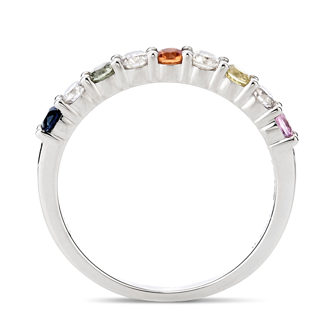 A brand-new, unused certified platinum ring, beautifully crafted to combine the lively colours of sapphires with the enduring sparkle of diamonds. The design features a cluster of round, mixed-cut, multi-coloured sapphires, totalling 0.38ct, each gemstone displaying its own vivid hue and natural character. These are complemented by mixed-cut natural diamonds with a combined weight of 0.25ct, graded F-G in colour and SI1-SI2 in clarity, offering a crisp brilliance that contrasts elegantly against the cool sheen of the platinum setting. The arrangement flows seamlessly around the band, creating a continuous display of colour and light that is both eye-catching and refined.