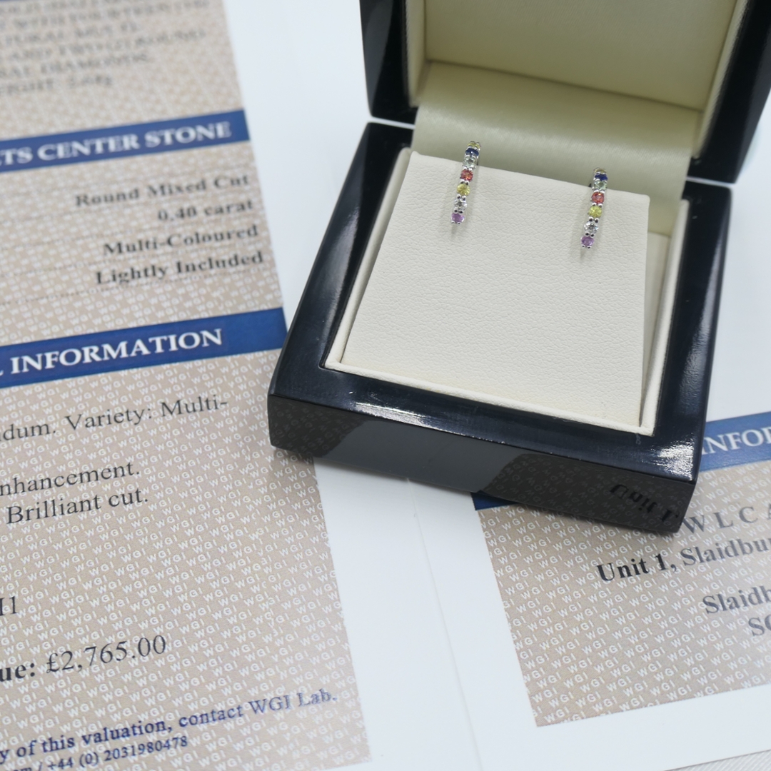A brand-new, unused, certified pair of natural diamond & multi-coloured sapphire gemstone hooped earrings, set with a cluster of round mixed-cut multi-coloured sapphire gemstones & two brilliant-cut diamonds, set in 18ct white gold.