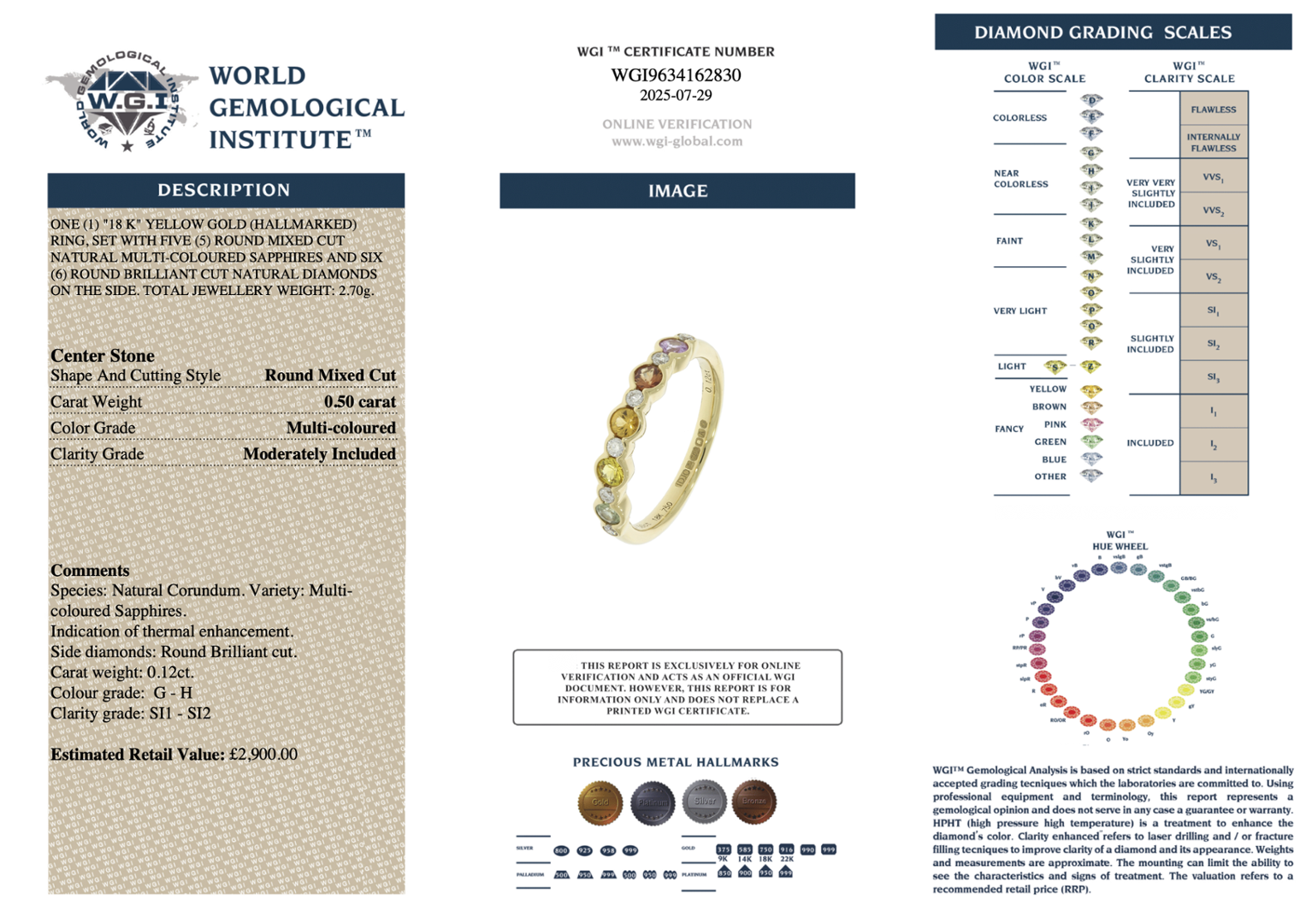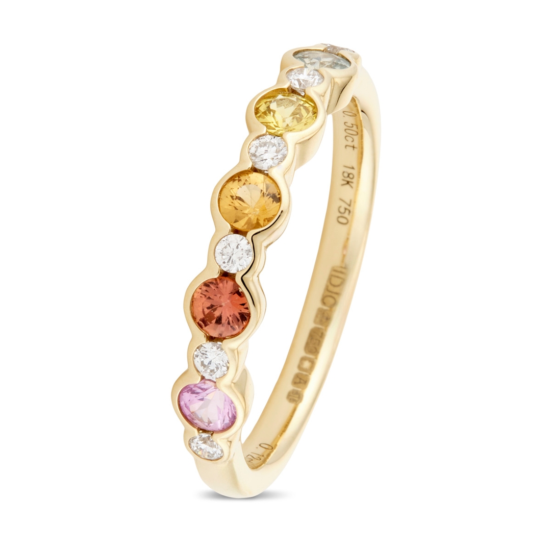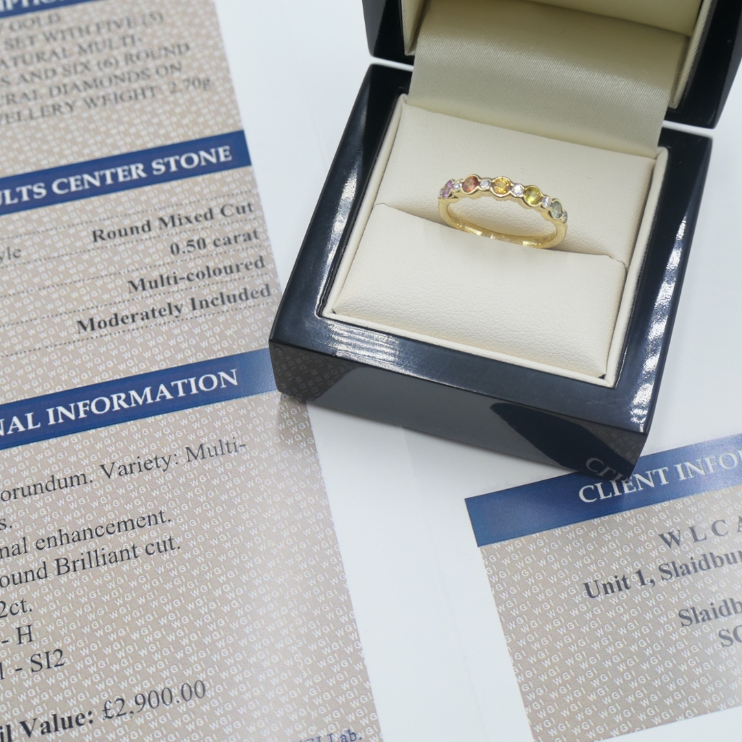 A brand-new, unused certified 18ct yellow gold eternity ring, crafted to combine the vibrant elegance of sapphires with the enduring brilliance of natural diamonds. Set with 0.50ct of round, mixed-cut, multi-coloured sapphires, each gemstone has been carefully selected for its vivid hue, clarity, and sparkle, creating a continuous flow of rich colour around the band. Enhancing the sapphires are 0.12ct of mixed cut natural diamonds, graded G-H in colour and SI1-SI2 in clarity, whose bright, lively sparkle contrasts beautifully with the warm glow of the yellow gold setting. The result is a piece that balances sophistication with a joyful play of colour.