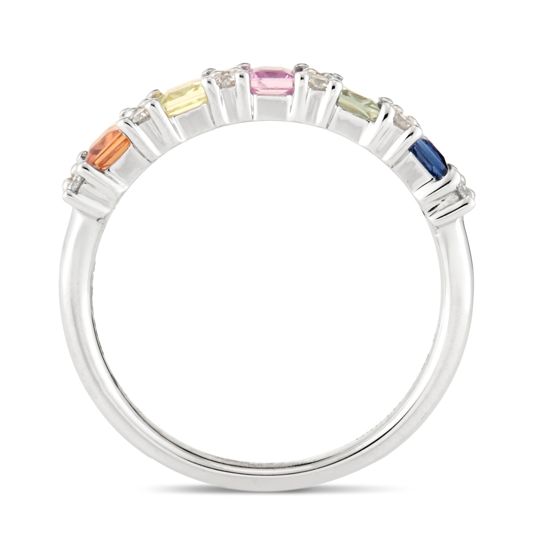 A brand-new, unused certified platinum cluster ring, crafted to showcase the perfect balance between vibrant sapphires and the enduring brilliance of natural diamonds. Set with a total of 0.58ct of round, mixed-cut, multi-coloured sapphires, each gemstone has been carefully chosen for its vivid hue, clarity, and sparkle, forming a colourful and harmonious arrangement around the band. Enhancing these are 0.13ct of mixed cut natural diamonds, graded F-G in colour and VS2-SI1 in clarity, whose crisp radiance contrasts beautifully with the sapphires and complements the cool, enduring lustre of the platinum setting. The result is a ring that is both elegant and timeless.