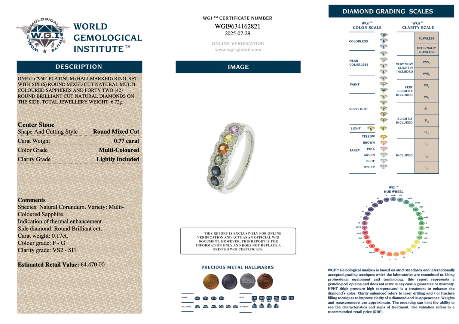 A brand-new, unused certified platinum eternity ring, with a weight of 6.72 grams, meticulously crafted to unite the vibrant allure of sapphires with the timeless radiance of natural diamonds. Set with 0.77ct of round, mixed-cut, multi-coloured sapphires, each gemstone has been hand-selected for its vivid hue, clarity, and brilliance, forming a flowing display of colour around the band. Enhancing this striking palette are 0.17ct of mixed cut natural diamonds, graded F-G in colour and VS2-SI1 in clarity, whose crisp sparkle contrasts beautifully with the richness of the sapphires and the superb, enduring lustre of platinum. This sophisticated design ensures lasting elegance and strength.