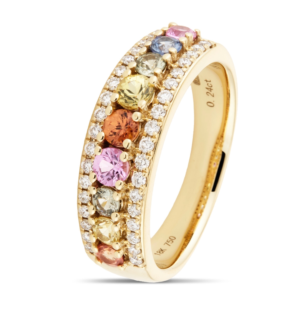 A brand-new, unused certified 18ct yellow gold cluster ring, beautifully designed to combine the rich vibrancy of sapphires with the timeless elegance of natural diamonds. Set with a total of 0.95ct of round, mixed-cut, multi-coloured sapphires, each gemstone has been carefully chosen for its vivid hue, clarity, and brilliance, creating a continuous flow of colour encircling the band. Accentuating the sapphires are 0.24ct of mixed cut natural diamonds, graded F-G in colour and VS2-SI1 in clarity, whose bright, crisp sparkle contrasts perfectly with the warmth of the yellow gold setting. This harmonious blend of colour and light ensures the ring is both striking and versatile.