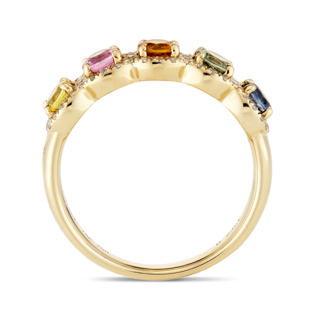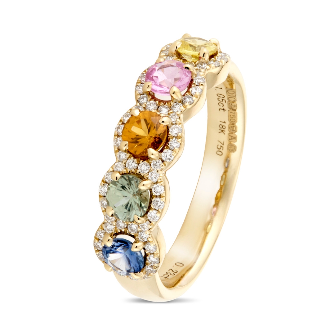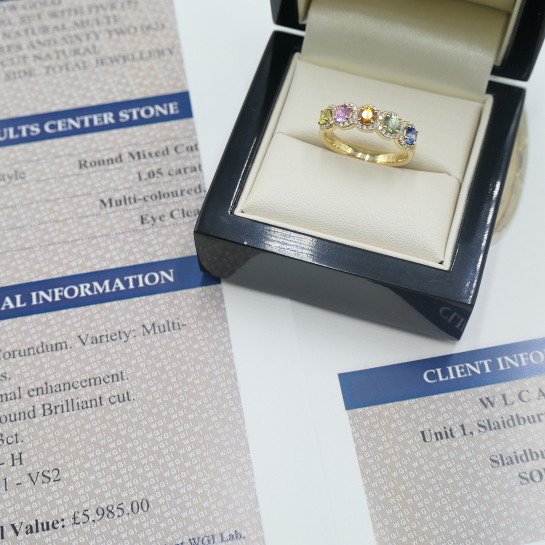 A brand-new, unused certified 18ct yellow gold cluster ring, crafted to unite the rich vibrancy of sapphires with the timeless brilliance of natural diamonds. Set with 1.05ct of round, mixed-cut, multi-coloured sapphires, each gemstone has been carefully selected for its vivid hue, fine clarity, and lively sparkle, creating a striking display of colour that flows seamlessly around the band. Enhancing the sapphires are 0.23ct of mixed cut natural diamonds, graded G-H in colour and VS1-VS2 in clarity. Their bright, crisp brilliance contrasts beautifully with the warm glow of the yellow gold setting, resulting in a design that is both elegant and enduring.