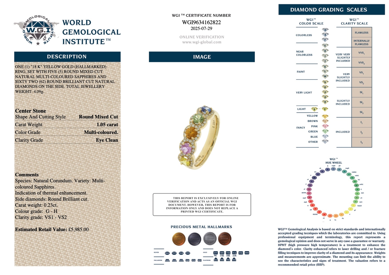 Natural diamonds are celebrated for their rarity, resilience and unmatched beauty. Beyond their aesthetic appeal, they are regarded worldwide as a secure and tangible investment, with high-quality stones often retaining or appreciating in value over time due to their scarcity and constant demand. In this ring, the diamonds not only provide exquisite sparkle but also add intrinsic worth, ensuring the piece remains as valuable in the future as it is today. Supplied with certification and a professional valuation of £5,985.00, weight of 4.09 grams. This ring offers the perfect balance of skilled craftsmanship, vibrant gemstones and the lasting prestige of natural diamonds.