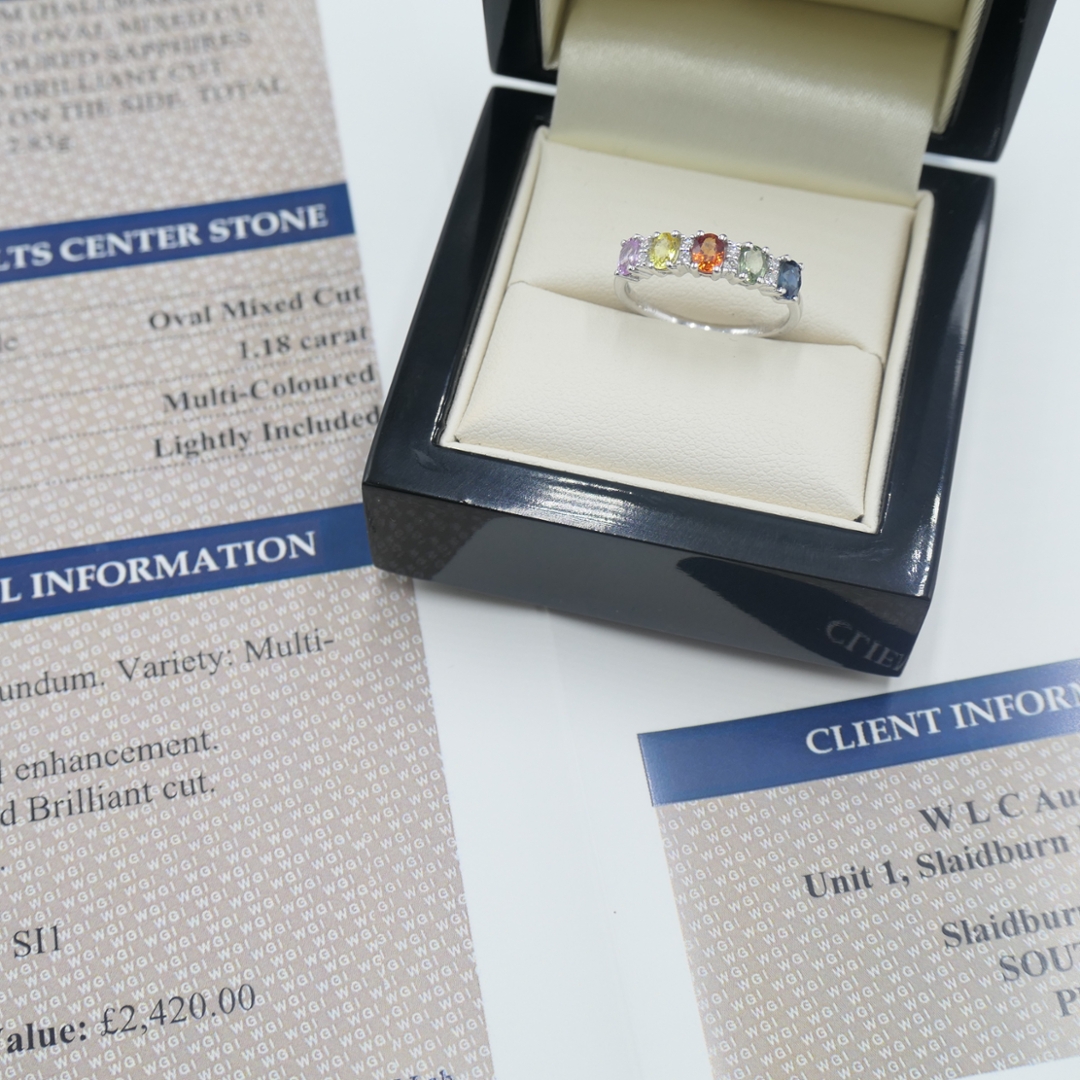 - > Natural Multi Coloured Sapphire 1.18ct & Diamond 0.10ct Eternity Ring