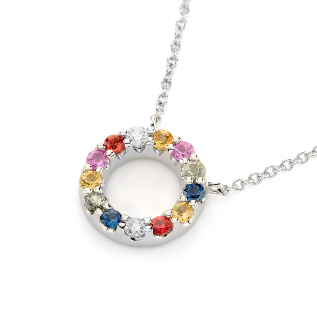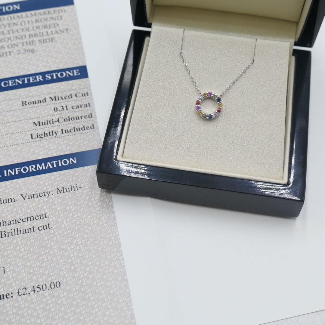 A brand-new, unused, certified 18ct white gold natural diamond & multi-sapphire gemstone circle-shaped cluster pendant, set with round mixed-cut multi-sapphire gemstones & brilliant cut diamonds.