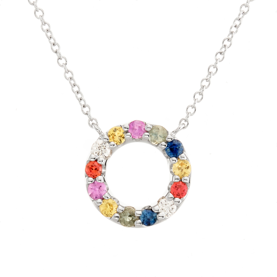 A brand-new, unused certified 18ct white gold pendant, designed in an elegant circle-shaped cluster that blends vibrant colour with refined sparkle. Set with 0.31ct of round, mixed-cut, multi-coloured sapphires, each gemstone has been carefully chosen for its rich hue and brilliance, creating a lively arrangement that shimmers beautifully in the light. Accenting this colourful display are 0.04ct of natural brilliant cut diamonds, graded F-G in colour and VS2-SI1 in clarity, whose crisp radiance enhances the cool elegance of the white gold setting. The result is a pendant that is timeless in design yet striking in its visual appeal.