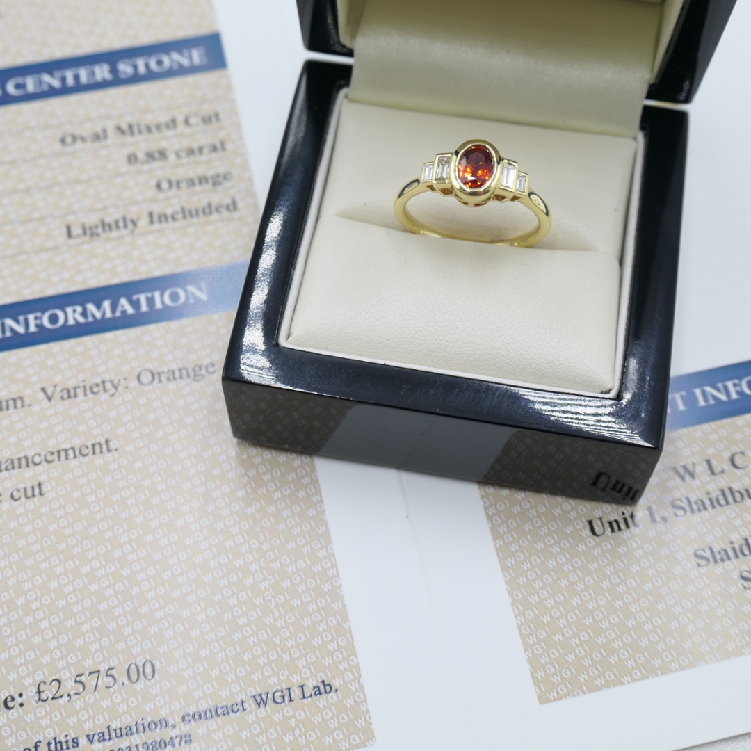 A brand new, unused certified 18ct yellow gold natural diamond and orange sapphire gemstone cluster ring. This striking piece features an oval mixed-cut orange sapphire at the centre, weighing 0.88 carats. The vibrant orange hue of the sapphire adds a bold and lively touch, making it an eye-catching focal point. On either side of the sapphire are four sleek baguette-cut diamonds, totalling 0.19 carats. The diamonds, graded SI1-SI2 in clarity and G-H in colour, offer a brilliant sparkle that beautifully complements the fiery orange of the central gemstone, enhancing the overall design.