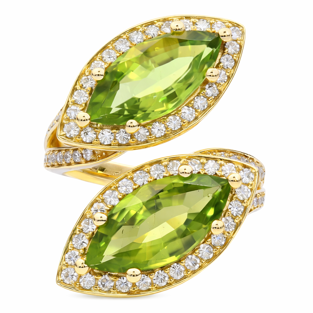 Encircling the centre stones is a radiant halo of brilliant-cut certified natural diamonds, extending gracefully onto the shoulders to enhance light and dimension. With a total diamond weight of 0.73ct, the natural diamonds provide exceptional sparkle, contrasting vividly against the vivid green peridot and the warmth of the yellow gold setting. Formed over billions of years, natural diamonds remain highly sought after for their rarity, authenticity and intrinsic value.