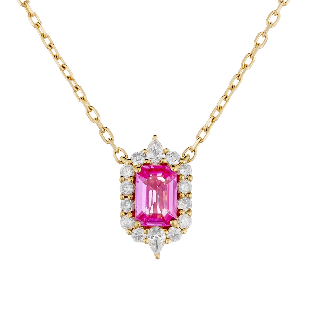 A brand-new, unused, certified natural diamond & pink sapphire gemstone cluster pendant, set with one octagonal step-cut pink sapphire gemstone at the centre & a cluster of brilliant-cut diamonds in a halo setting, set in 18ct yellow gold.