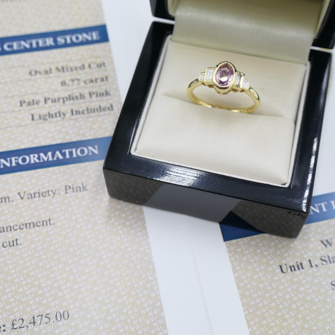 A brand new, unused, certified 18ct yellow gold natural diamond and pink sapphire gemstone cluster ring. This elegant piece features an oval mixed-cut pink sapphire at its centre, weighing 0.77 carats. The pale purplish-pink hue of the sapphire adds a soft, romantic touch, creating a beautiful focal point. On either side of the sapphire are four baguette-cut diamonds, totalling 0.17 carats, which add sophistication and enhance the overall design. The diamonds, with clarity grades of SI1-SI2 and colour grades of G-H, offer remarkable brilliance, complementing the soft tones of the pink sapphire.