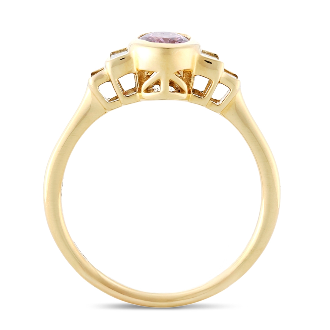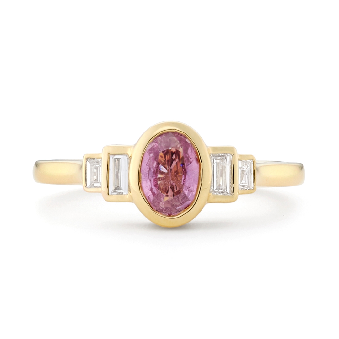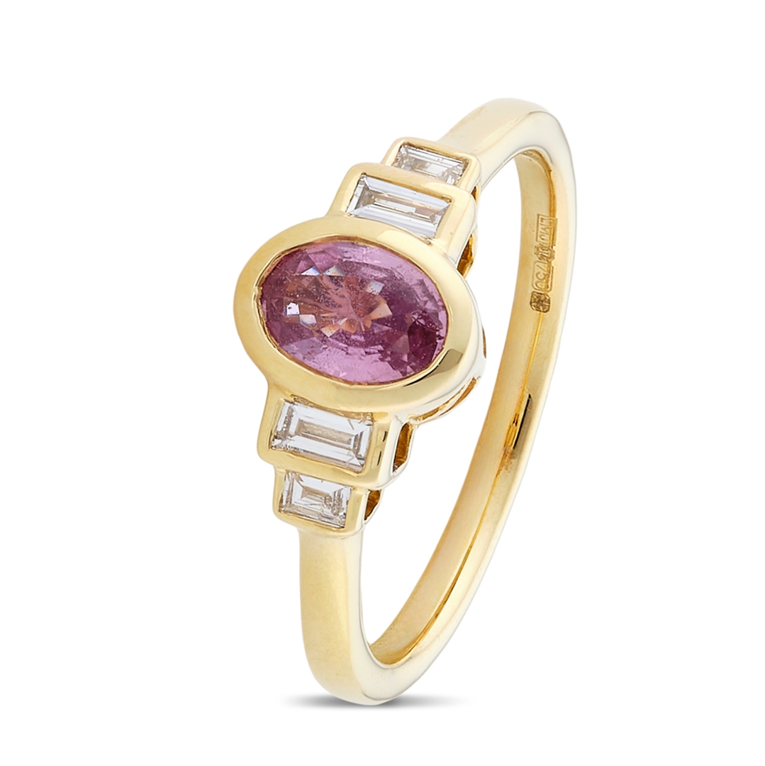 Crafted from luxurious 18ct yellow gold, weighing 3.59 grams, this ring combines warmth and elegance, offering a timeless piece that can be worn for any occasion. The unique combination of the pale pink sapphire and the sleek baguette-cut diamonds makes this design both contemporary and classic, making it a standout piece in any jewellery collection.