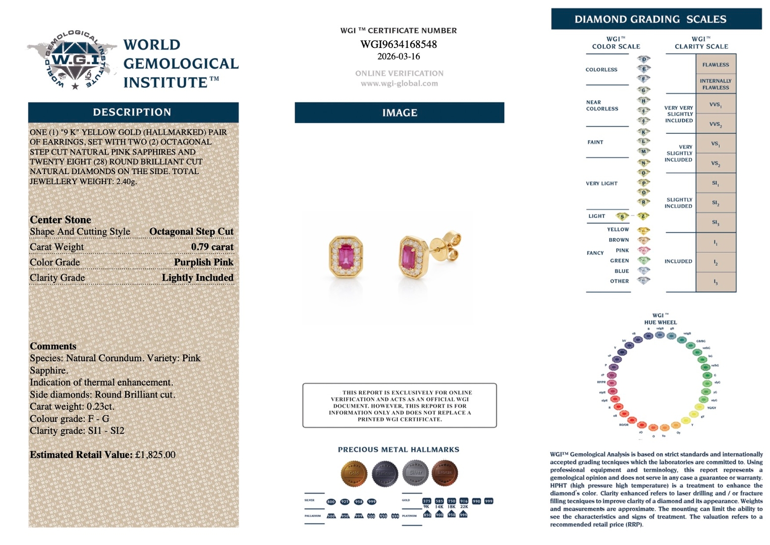A brand-new, unused and certified pair of natural diamond and pink sapphire cluster earrings, crafted in a refined Asscher-shaped design, each set with an octagonal step-cut pink sapphire at the centre and surrounded by a halo of brilliant-cut natural diamonds. The structured geometry of the design enhances the soft pink tones, while the 9ct yellow gold setting introduces warmth and a classic finish that complements the overall composition.